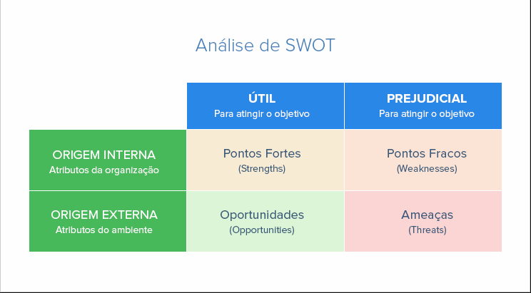 O acrônimo S.W.O. T significa nada mais, nada menos que: Strenghts, Weaknesses, Opportunities e Threats, que pode ser traduzido como Forças, Oportunidades, Fraquezas e Ameaças, ou se preferir F.O.F.A.